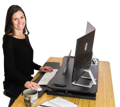 is a device that's placed on top of your existing sitting desk to turn it into a sit to stand desk with an elevated work surface. It is also often called a standing desk converter.