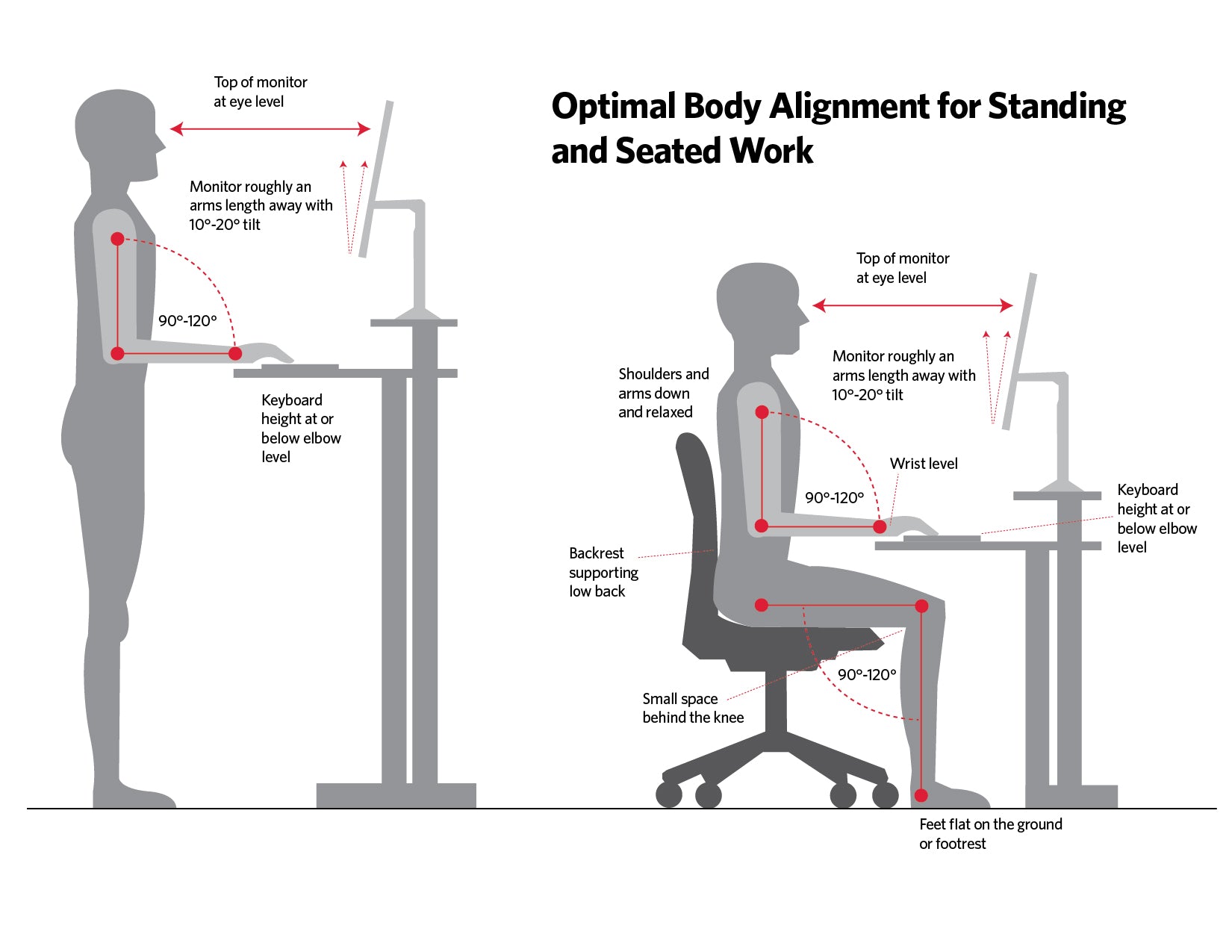 - Alternate: Use a sit-stand desk to alternate between sitting and standing. Stand for a while, then sit when you get tired, and vice versa.